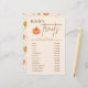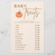 Perfeito para uma reunião neutra em termos de gênero ou personalizado para o ajustado de um bebê ou chá de uma menina, este jogo reúne deliciosos temas de abóbora laranja e azul. É uma atividade envolvente que funde o calor das vibrações do chá de fraldas do outono com ideias criativas de chás de fraldas de abóbora, incluindo elementos de boho. Ideal para adicionar um toque divertido e festivo ao seu evento, este jogo é certamente um sucesso entre os hóspedes entusiasmados para adivinhar e rir sobre potenciais traços do bebê!