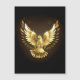 Pombo dourado voando em um fundo preto.