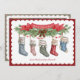 Este cartão de Natal contém 5 meias penduradas num saco de folhagem sazonal, para cada membro da sua família. Você pode personalizar cada estoque com um nome. Há uma faixa vermelha sobre o pântano com a saudação "Feliz Natal". O verso apresenta uma foto da sua família.