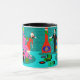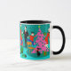 Esta família retro que apara a caneca da árvore de Natal contem cada tradição do feriado mas o fruitcake. Uma família dos desenhos animados dos anos 60 está em casa em sua sala de visitas moderna do meio século. Há uma parede de tijolo de turquesa e de cerceta e um vermelho, lareira do cone com um fogo rujir. O pai está vestindo um terno preto e um laço vermelho. Está pendurando meias verdes do Natal na chaminé da modificação com cuidado. Ao lado do pai, o júnior é empoleirado precària em uma cadeira alaranjada. Whoa! Fácil lá, júnior! Está alcançando para fora para pôr um ornamento sobre um kitchy, cor-de-rosa, a árvore de Natal que é já decked para fora com ornamento da cerceta e uma estrela amarela. No lado oposto da árvore, a mamã está guardarando um presente festiva envolvido. Hey, nenhuma agitação permitida! A mamã está vestindo um vestido vermelho brilhante do wiggle com guarnição branca. Igualmente está vestindo um chapéu do papai noel. Abaixo da árvore, há um gato preto lustroso que veste um arco vermelho. No assoalho, há um jogador gravado verde e preto cercado por álbuns coloridos do vinil. Você apenas sabe que a família está cantando junto com suas canções de natal favoritas do Natal quando forem decking os salões.