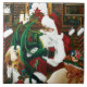 Papais noeis com um jovem dragão verde no colo. Os papais noeis estão cheios de brinquedos, grifo de bebê, unicórnio branco bebê e dois gatos nas prateleiras de livros. Por trás está uma lareira, estantes de livros cheios de livros e tapeçarias de um boneco de neve