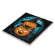 Uma figura fantasmagórica num chapéu de bruxa abriga sobre duas abóboras esmeriladas sob um céu iluminado, cercadas por árvores escuras e morcegos voadores, incorporando o espírito do Dia das Bruxas.