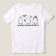 Camiseta moderna de Halloween com 3 fantasmas, aranha, morcego e bebida de especiarias de abóbora. Frase diz "A Temporada Assustadora Chegou"