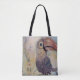 Um tucano colorido com um bico grande é representado contra um fundo de abas macias com flores delicadas. Ela parece empoleirada, com suas penas processadas de forma texturizada, dando à ave uma presença viva e vibrante. Amigos da natureza na impressão — Garden Goonies — Bolsa de pássaro da fantasia criado da arte original acrílica — Espalhem uma risada de cada vez