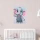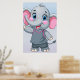 Poster de um lindo elefante de desenho animado com grandes olhos azuis e bochechas rosadas está balançando alegremente.