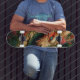 O skate de dragão fantasma em ouro, coral e turquesa.