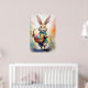 Poster de um coelho alegre num carregando de roupa azul, uma cesta cheia de ovos coloridos e decorados. O fundo apresenta detalhes florais suaves e cores suaves e quentes.