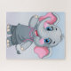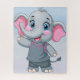 Quebra-cabeça de quebra-cabeça de um lindo elefante de desenho animado com grandes olhos azuis e bochechas rosadas balançando alegremente.