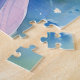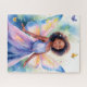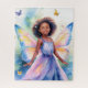 Quebra-cabeça de quebra-cabeça de uma criança alegre com asas coloridas de borboletas em pé num vestido roxo, rodeado por borboletas e cores suaves e sonhadoras. A cena transmite uma sensação de capricho e magia num ambiente vibrante e inspirado na natureza.
