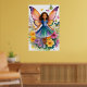 Poster de uma jovem com asas vibrantes de borboletas cercadas por flores coloridas, expondo um senso de magia e capricho. Seu vestido espelha as matizes das asas, combinando as borboletas brilhantes fluindo ao seu redor.