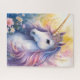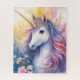 Quebra-cabeça de quebra-cabeça de um monocórnio majestoso com uma buzina ouro cercada por flores vibrantes. Seu homem flui em tons roxos, cor-de-rosa e azuis, se misturando perfeitamente em um cenário suave e sonhador.