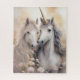 Quebra-cabeça de quebra-cabeça de dois unicórnios que se unem em um campo de sonho cheio de flores macios e pastéis. Os seus homens fluentes apanham a luz de um pôr do sol gentil, destacando a sua presença majestosa.