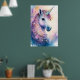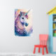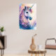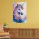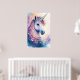 Poster de um monocórnio majestoso com um buzino brilhante e colorido é representado em meio a um fundo sonhador de cores pastéis moles. Seu homem fluente é enfeitado com flores delicadas, criando uma cena etérea e encantadora.