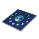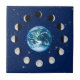 Azulejo cerâmico nas fases da lua, circundando uma Terra girada a azul, sobre fundo estrelado