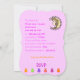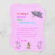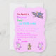 Convites de festas de menina Um convite de festas adorável a rosa, apresentando uma garota em um vestido de noite que está voando em uma borboleta, uma fona em um cogumelo de fada e unicórnios alados. Na parte de trás está uma lua farta e ursos de geleia. Personalize com o nome da garota, tipo de festa, local, horários e número de contato. Há espaço para dar mais informações, se necessário.