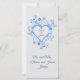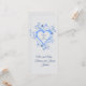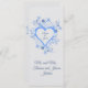 Este é um pequeno cartão de guardas de casamento seria bom colocar em cada mesa como um favor de convidado. Exprime o apreço da noiva e do noivo pela presença. A design é um quadro cardíaco romântico com o nome do casal de casamento na frente. O coração aberto é azul-céu. O coração é elaborado com duas flores diferentes. A maior flor de pétalas é azul pálido. A flor em forma de estrela menor é azul real. Há grama graciosa curvando em espirais bonito junto com folhas minúsculas. O texto no verso tem um obrigado para você. Você pode apagar o coração no verso e carregar uma foto do casal se quiser. Você pode alterar todo o texto para personalizar. A cor de fundo também pode ser alterada. Outros itens com este design estão disponíveis também na coleção "Love" em minha loja.