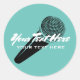 Modelo de adesivos de imagem de microfone com design de logotipo vetorial. Autocolantes personalizados ou seladores de envelopes. Apresentação profissional adequada para cantor, cantor, treinador vocal, indústria musical, técnico de som, músico, intérprete, auto-falante corporativo, comediante de pé, especialista em equipamento de áudio, dj, dj, deejay, jóquei em disco, entretenimento, engenheiro de som, produtor, construtor de palcos, gravação de voz, apresentador de rádio, jornalista, jornalista de notícias, especialista em eletrônicos, entretenimento e outros trabalhos ou trabalho relacionados. Ícone clássico de microfone isolado preto e branco com nome personalizado e cores de fundo. Crie seus autocolantes redondos exclusivos para seu compro profissional, escritório, estúdio, performances, shows, chefe, festa de casamento, evento etc. Ícone gráfico moderno com tipografia de script na moda elegante. Fundo de cor azul ou personalizado.