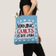 "Fazer Quilts Is My Jam" é um design de texto bonito, em azul, com texto preto e vermelho, junto com uma forma de sotaque branca e pontos brancos texturizados ao seu redor.