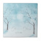 Azulejo cerâmico com aquarela paisagem refinada no inverno em tons azuis. No centro estão duas árvores cobertas de névoa geada de neve, os ramos das árvores criam uma fina teia contra o céu e se estendem em direção umas às outras no charme de inverno criando uma imundície por muitos anos. Azulejo de cerâmica fresca e tenra. Coleção de Febre de inverno.