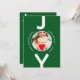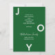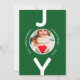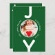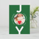 Um simples cartão de Natal minimalista, a verde e branco. Na frente: Um fundo verde clássico, com a palavra JOY escrita com letras brancas em negrito. A letra O é usada como quadro fotográfico. Personalize e adicione sua própria foto da família, nome e ano. Fundo: fundo verde e texto branco. Adicione seus próprios cartões de natal e nomes de família. As letras da palavra JOY como decoração.