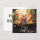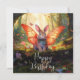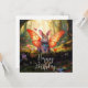 Um coelho branco com asas de fada coloridas senta-se num galho numa floresta encantada, cercado por luz brilhante e folhas em queda. A atmosfera vibrante e mágica aponta para uma aventura fantástica. Feliz Aniversário em molas decorativas de flores silvestres