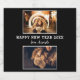 Rótulo de vinho espumante do Feliz ano novo preto 2023, com 2 imagens por fotografia. Adicione duas das suas fotos de feriado favoritas. O texto do Feliz ano novo está em um roteiro moderno e moderno.