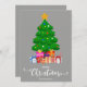 Cor de fundo da cinza Feliz Natal em letra de estilo de script com um gráfico de uma árvore de Natal e presentes empacotados sob sua design. Este cartão de Natal foi projetado para que você possa mudar a cor do plano de fundo e também digitar seu nome de família. Você também pode editar esta design para mudar a cor da palavra "Natal", se quiser.
