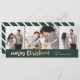 Um cartão com fotos festivo com um guião de Natal dourado com três fotos e um fundo verde.
