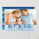 O cartão de saudação de fotos "Happy Hanukkah" moderno apresenta tons monocromáticos de texto azul personalizado para você personalizar, espaço amplo para exibir uma foto paisagem e faixas horizontais arrojadas que destacam o lado traseiro da placa.