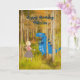 Cartão de aniversário para Alexus com um dinossauro no bosque dando um presente à garota. Obrigados à Hungryjpeg para alguns dos elementos do design.