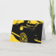 Vette em um fundo amarelo. Design tem "Feliz aniversário!" em vermelho. A parte traseira da placa tem uma imagem de close-up de um Corvette clássico.