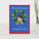 Um cartão de Natal com uma coroa de santo e mariposa com um Robin Redbreast preso atrás do arco de fita de ouro, de um design de colagem de papel pintado à mão por Judy Adamson. A saudação à frente, em letras brancas, é "Feliz Natal e Feliz ano novo!" e a dentro é deixada vazio para a sua própria mensagem.