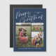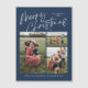 O Cartão Magnético de Foto de Natal Merry Azul apresenta um roteiro calítico moderno na frente, juntamente com três fotos, e uma xadrez de Natal festiva nas costas.