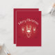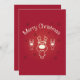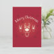 Um convite de festas de natal. Uma ilustração feliz de Natal. Um desenho animado de renas, giro e adorável. Fundo vermelho festivo com flocos de neve caindo.