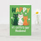 Este cartão mostra três gatos estilizados enfileirados em um fundo verde-esmeralda profundo, seus corpos dispostos em uma fileira horizontal constante que parece próxima e companheira 💚. À esquerda, senta-se um gato verde-floresta com olhos amarelos intensos, inclinado ligeiramente para o centro como se estivesse fazendo companhia aos outros. No meio, um gato branco está pontilhado com pequenas formas de trevo, e seu rosto calmo parece encontrar o olhar do gato da esquerda de uma maneira silenciosamente afetuosa ☘️. À direita, um gato laranja-avermelhado completa o trio com um sorriso suave que combina com o clima amigável do grupo. Trevos brancos flutuam ao redor deles como confetes leves, preenchendo o espaço sem amontoar os gatos. Perto do topo, “FELIZ” aparece em letras arredondadas, alternando entre verde-claro, laranja e branco ao longo da palavra. Ao longo da parte inferior, “DIA DE SÃO GAT