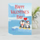 Nosso cartão de dia dos namorados para casal de pinguins é uma maneira fofa de compartilhar seu amor neste dia especial. A frente do cartão plano apresenta um cenário ártico, com alguns blocos de gelo flutuando no mar, e um pinguim macho e uma fêmea sentados em um bloco de gelo. O texto diz: "Feliz Dia dos Namorados".