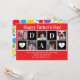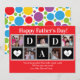 Papai vai adorar este cartão personalizado do Dia dos Pais. Há modelos para 5 das suas fotos favoritas das crianças em um padrão de bloco com P A I escrito no meio e um coração de cada lado com o ano. Na parte inferior há uma mensagem pessoal ao Papai. Use-a como está ou adicione sua própria mensagem. Personalize com os nomes das crianças abaixo disso. O fundo é vermelho e o verso é um padrão de pontos de diferentes tamanhos em vermelho, azul, amarelo e verde.