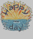 Um sol alegre sobe ao longo de um horizonte azul com raios coloridos espalhando-se para fora, acompanhado pelo texto "feliz novo dia!" em letra lúdica. uma vibrante e otimista peça de arte.