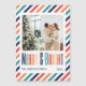 Este cartão de Natal apresenta um texto de tipografia de cores retrorreflectoras "feliz & brilhante", os nomes da família, o ano e a fotografia num fundo de listras retrorreflectoras.