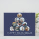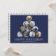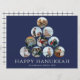 Não pode escolher apenas uma ou duas das suas fotos de família favoritas? Estes cartões de saudação chanucá planos de 8,75" x 6,5" incluem espaços reservados para 10 das suas fotos favoritas, nome da família e ano. As fotos estão todas redondas em forma de bordas azuis de marinho. A saudação, Feliz Chanucá está de branco.