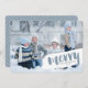 Uma saudação moderna de "feliz'' é a frente e o centro dessa design que incorpora texto escrito em pincel e sotaque pintado para um olhar contemporâneo que é único. Envie uma saudação memorável para a família e amigos com este cartão com fotos que apresenta uma imagem de grande tamanho da sua família na frente e coordena o padrão listrado na parte de trás, tudo em tons azuis suaves de inverno.