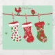 : Uma garrafa de vinho festiva, com um rótulo com o tema das férias, com meias coloridas de Natal penduradas numa linha de roupa. Cada estocagem tem um padrão único em vermelho, verde e branco, adicionando um toque alegre. Um pequeno pássaro se aproxima, melhorando o conforto, o sentimento de feriado. O fundo é leve e macio, fazer as meias vibrantes se destacam, perfeito para presentes durante o feriado.