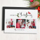 Este design de feriado único e festivo apresenta três modelos de fotos quadradas, texto editável e uma caligrafia feliz de Natal embelezada com botânicos coloridos de inverno e um doce cardeal vermelho.