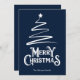 Feliz Natal na fonte decorativa com estilo de escrita com um esboço de uma árvore de Natal e estrela no design. Esta cor azul escura de fundo do cartão de Natal foi projetada para que você possa mudar a cor do fundo e também digitar o nome da sua família.