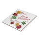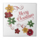 Este azulejo festivo de Férias apresenta uma bonito trio de imagens de ouro, vermelho e flor de Natal verde no topo à esquerda, e mais na parte inferior direita. As flores são embelezadas com designs de espiral vermelha. O texto decorativo ao lado diz "Feliz Natal" em vermelho. Tudo é colocado sobre um fundo branco de neve. Bonito para a época de Natal!