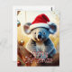 Koala australiano sentado numa árvore vestindo um chapéu de santa. Este coala peludo é um nativo da Austrália que eles são facilmente reconhecíveis pelo seu corpo escondido, sem caudas e cabeça grande, com orelhas redondas, lisas e nariz grande e em forma de colher.