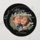 Um cartão com fotos de Natal redondo com um verde e uma coroa de pinhinhos, uma área que você pode adicionar facilmente uma foto, um texto branco que leia Feliz Natal, e uma área que você pode adicionar seu nome e ano atual na frente. A parte traseira da placa é preta com texto branco rico que lê Felizes Feriados com flocos de neve casal. Fotografia © Storytree Studios, Stanford, CA