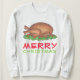 A camiseta apresenta uma ilustração original de um peru em uma bandeja, com MERRY CHRISTMAS em uma fonte divertida. Perfeito para uma festa feia de suéter de Natal!