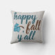 Almofada divertida de outono! Tipografia moderna em azul turquesa e marrom diz "feliz outono para todos" ao lado de uma folha caída encantadora. Fundo cinza suave. Ótimo para o Outono!