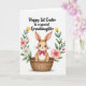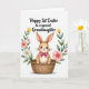 Este cartão apresenta um adorável coelhinho 🐰 sentado confortavelmente em uma cesta de vime marrom quente, com grandes olhos brilhantes, cílios macios e bochechas rosadas que lhe dão um olhar gentil e afetuoso. Suas orelhas longas mostram o interior rosa claro, e um laço cor de fúcsia brilhante no pescoço adiciona um toque fofo que parece um presente amigável. Em torno do coelhinho, há uma grinalda de primavera feita de flores e folhas, disposta como um abraço acolhedor. As flores incluem pétalas rosa suave, flores brancas semelhantes a margaridas com centros amarelos e flores em forma de tulipa amarelas escondidas entre a folhagem verde, todas com um visual levemente pintado. O fundo permanece branco simples, fazendo com que a textura tecida da cesta e as cores das flores se destaquem claramente. Centralizado acima da ilustração, uma linha de texto preto diz “Feliz 1ª Páscoa para uma neta especial”, em um estilo fluído e elegante. Um pequeno detalhe 🌷 aparece entre as flores,